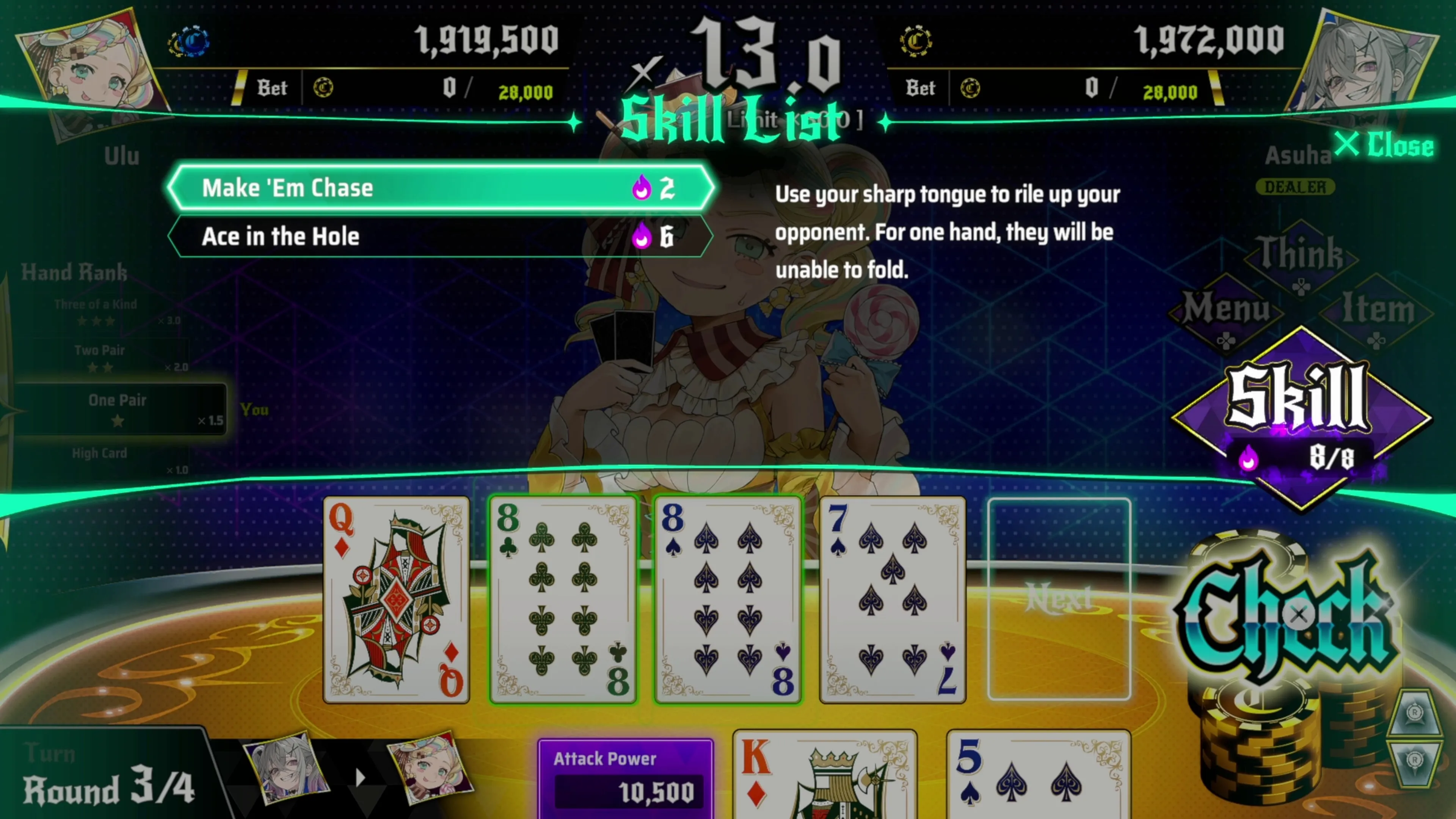Utiliza diversas habilidades para alzarte con la victoria en el póquer, descubre las cartas de las brujas, haz All-in para robar sus ganancias y conviértete en el gobernante del distrito de apuestas.