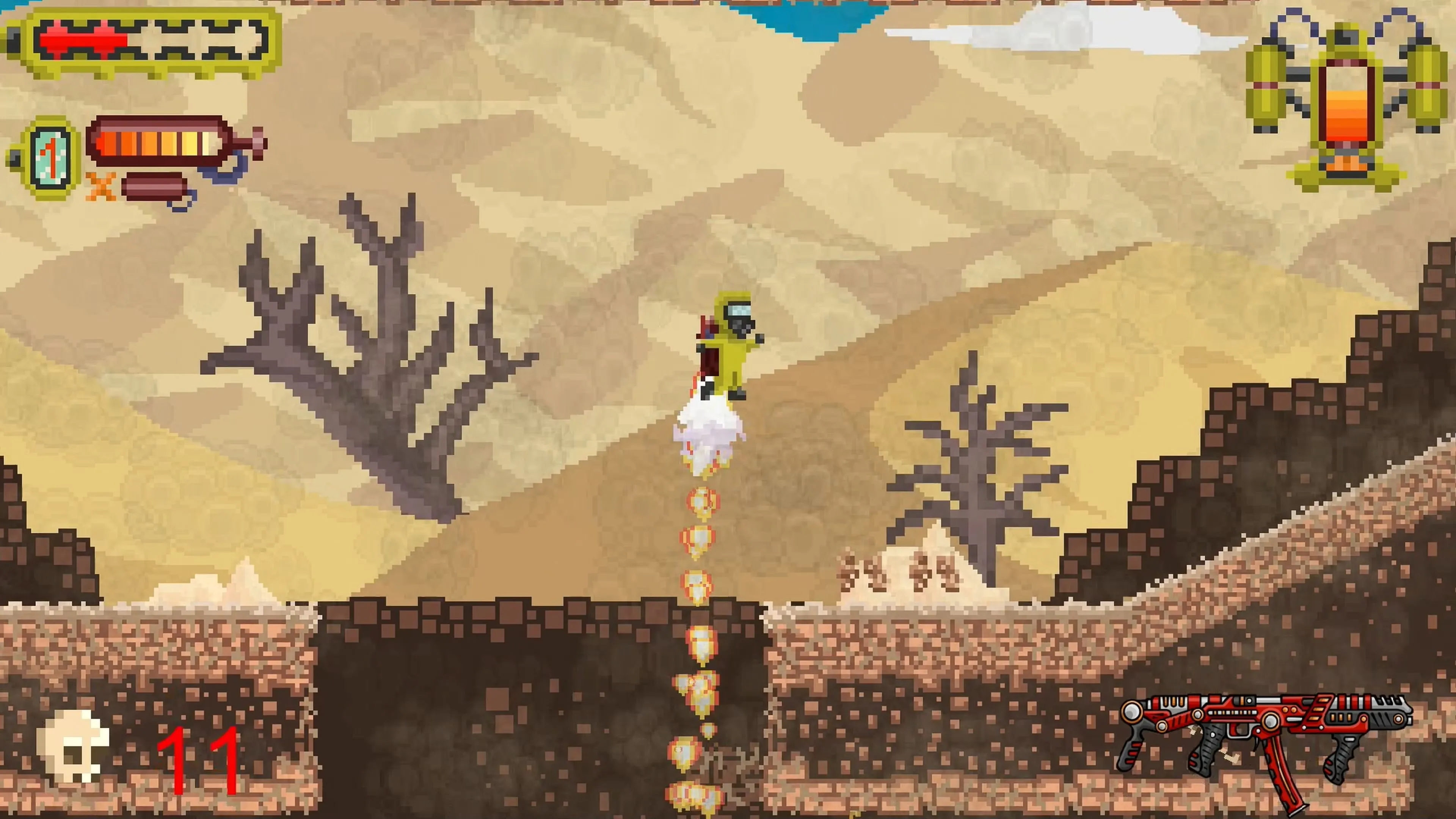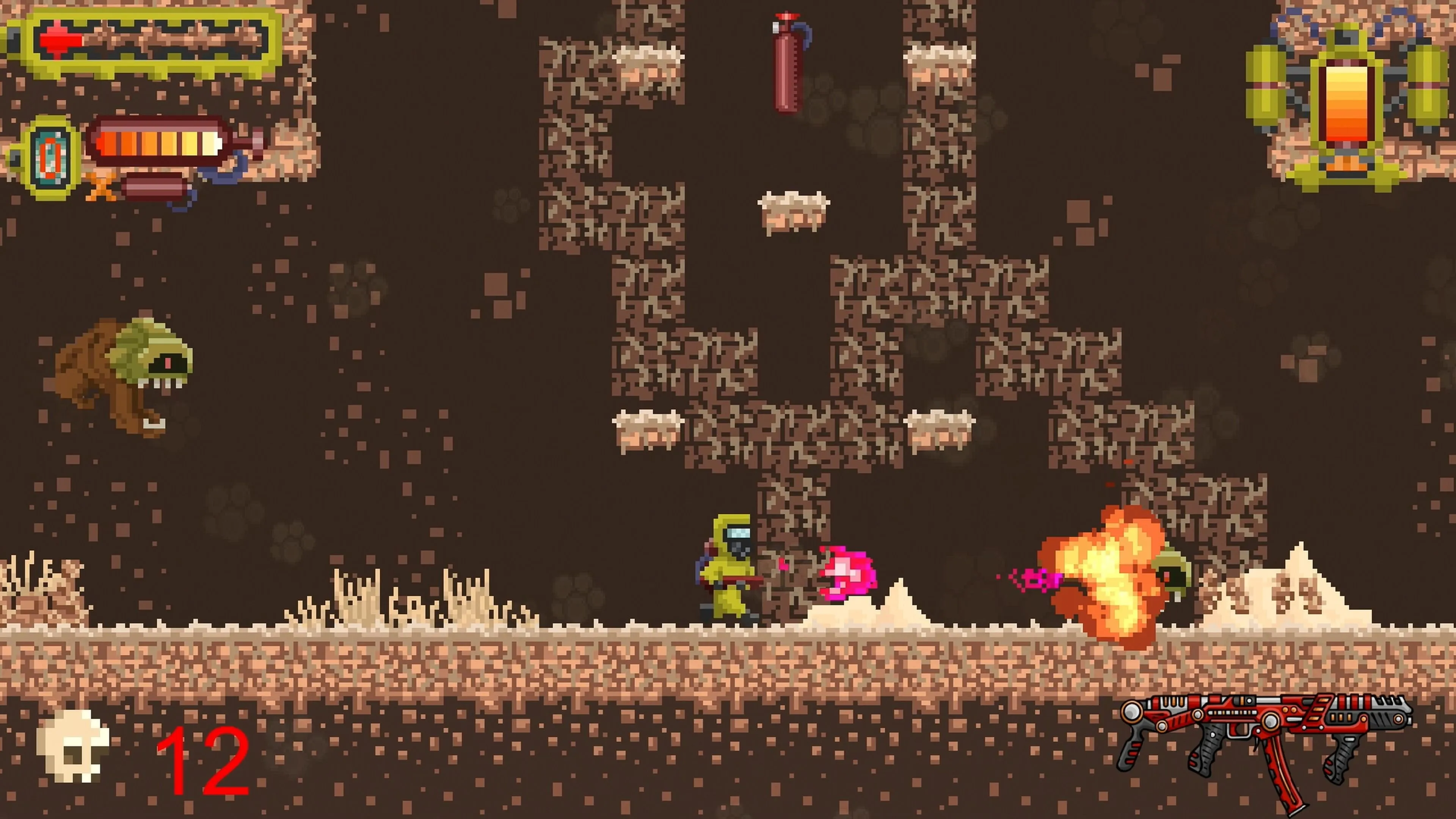 Pero ¡ten cuidado! Cada nivel está lleno de enemigos errantes. Algunos monstruos atacan usando su fuerza bruta, mientras que otros llevan armas para luchar cuerpo a cuerpo o emiten proyectiles mágicos. Para mejorar tus posibilidades y eliminarlos antes de que te logren vencer, deberás utilizar un nutrido arsenal de armas de fuego, lanzaproyectiles y lanzallamas. Si te quedas sin munición, asegúrate de tener otra arma a mano, ¡o estarás indefenso! La mochila propulsora puede salvarte, pero su combustible es limitado. ¡En este desafío brutal, deberás administrar tus recursos para sobrevivir a tus rivales!