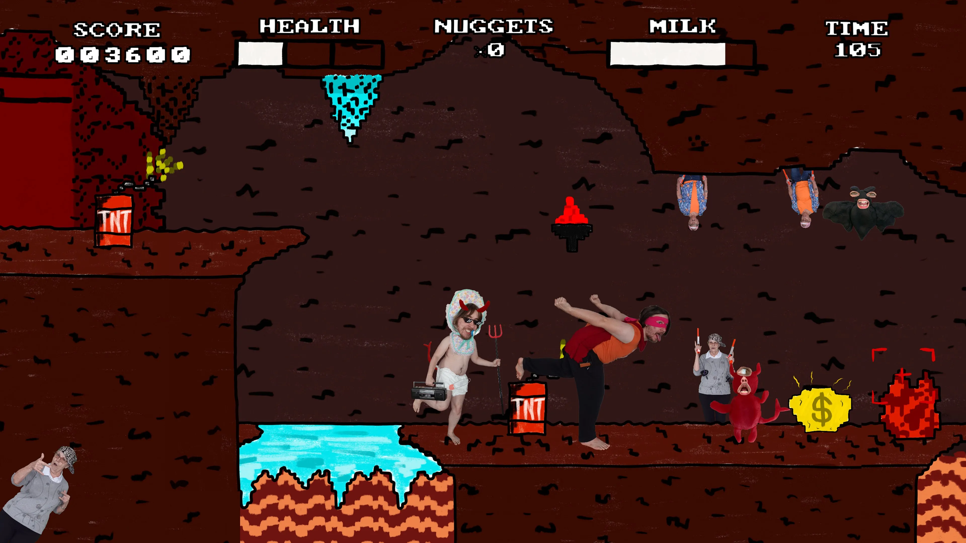 Esto va a sonar mucho más fácil de lo que realmente es, Baby Boomer es en realidad un niño un poco travieso, no porque moje sus pañales (lo cual hace, no me malinterpretes) sino porque de alguna manera todos en la tierra están en contra. él, también es un poco tonto, así que irá al infierno por error, ¡prepárate para luchar contra demonios, esqueletos e incluso motosierras andantes! ¡Este podría ser el juego más frustrante y desafiante que jamás hayas jugado!