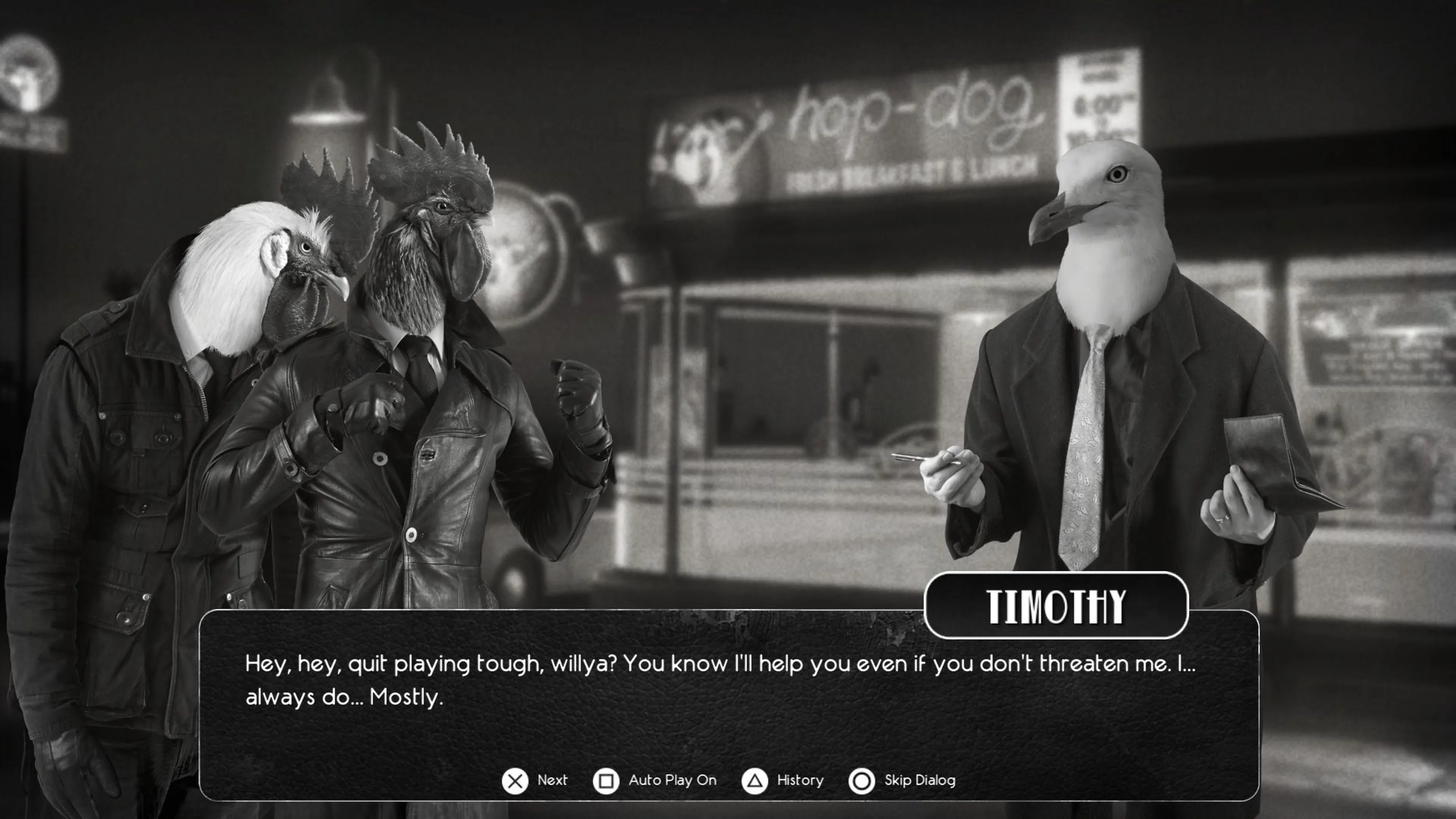 Chicken Police es un juego rico en historias y diálogo que combina elementos de las novelas visuales y los clásicos juegos de aventuras. El juego tiene más de 30 personajes para hablar, y algunos deben ser interrogados seriamente. ¡Reúne toneladas de pistas, evidencia e información personal altamente sensible de los personajes sombríos de Clawville para usarlos despiadadamente contra ellos!
