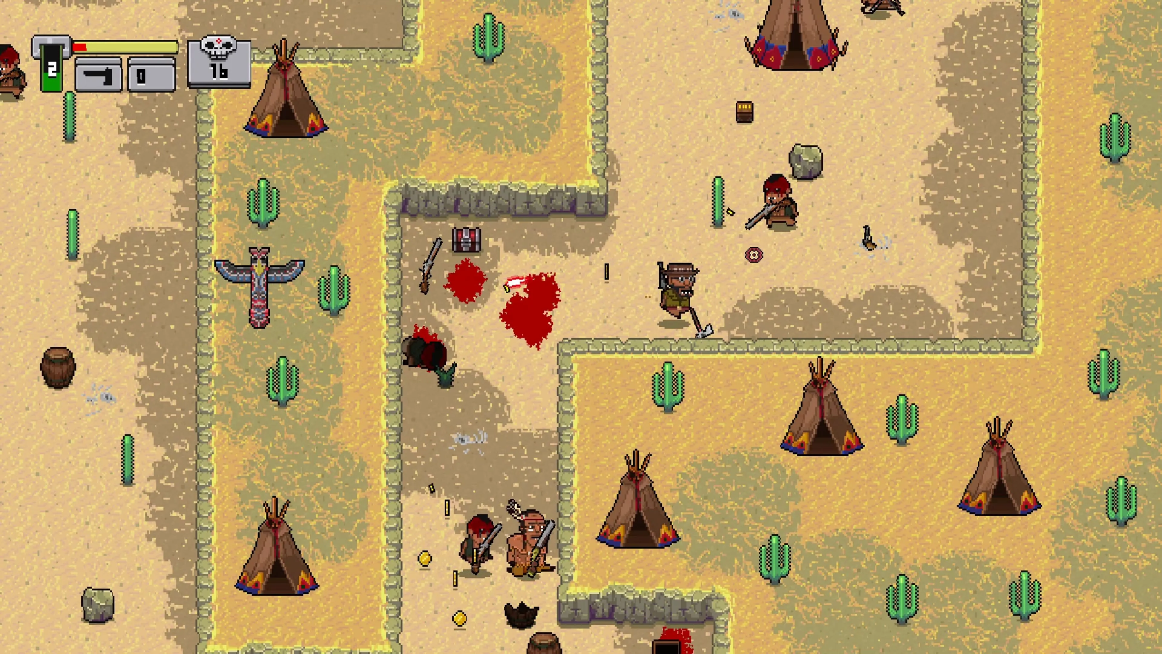 Es hora de que elijas un héroe y corras entre la multitud de enemigos mortales: indios enojados, bandidos e incluso algunos extraterrestres con sus cañones de plasma futuristas. Tendrás que mantenerte con vida a través de todos estos desafiantes niveles, también tendrás que recolectar el botín de los enemigos caídos. También hay algunas cosas que hacer: descubrir los secretos de Dead Dust y hablar con los camareros que te venderán el equipo más útil para superar los obstáculos o albergues en tu camino para salvar a la chica secuestrada.