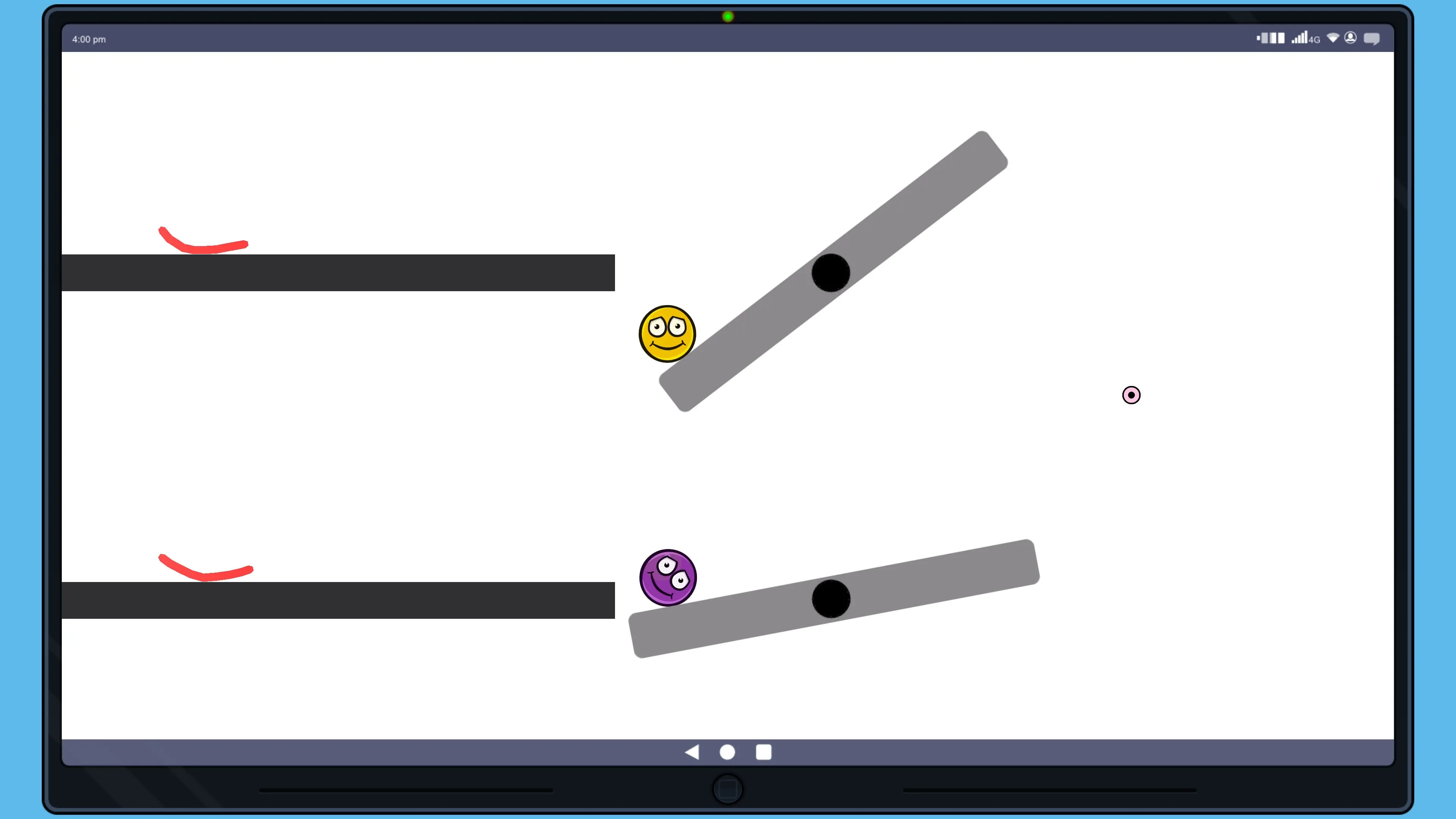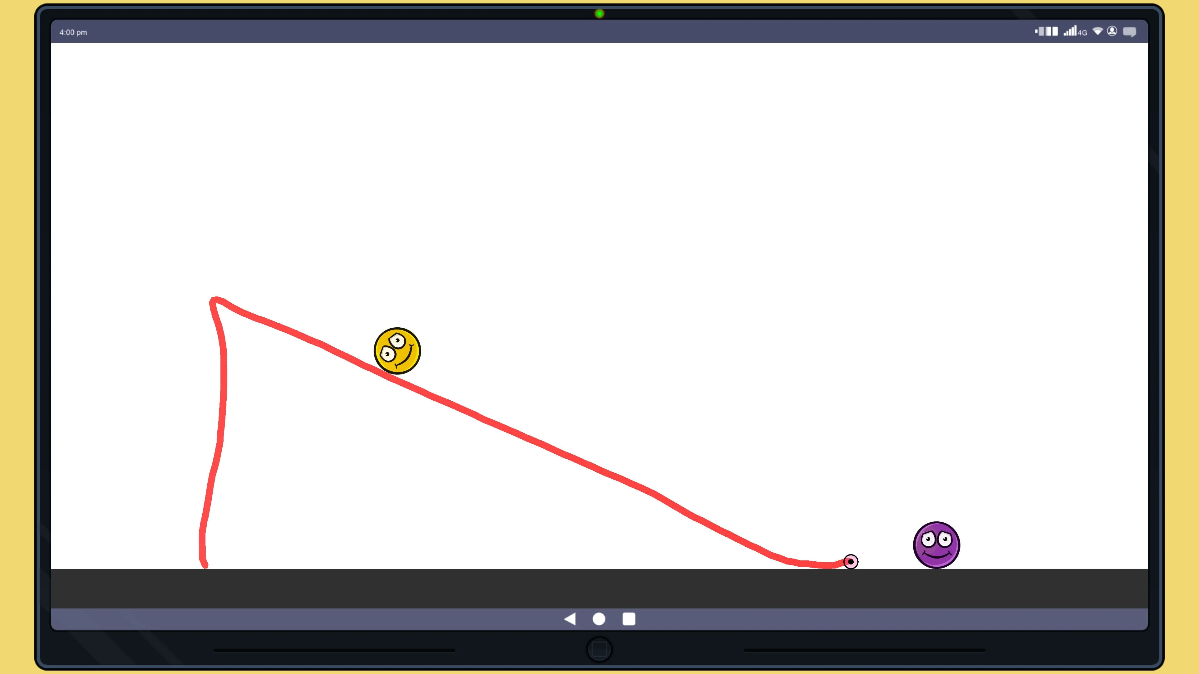 Juega en una ventana 2D donde tu misión es conectar una bola amarilla con otra morada. Dibuja líneas que obedezcan las leyes de la física para hacer rebotar la bola o crear un camino.