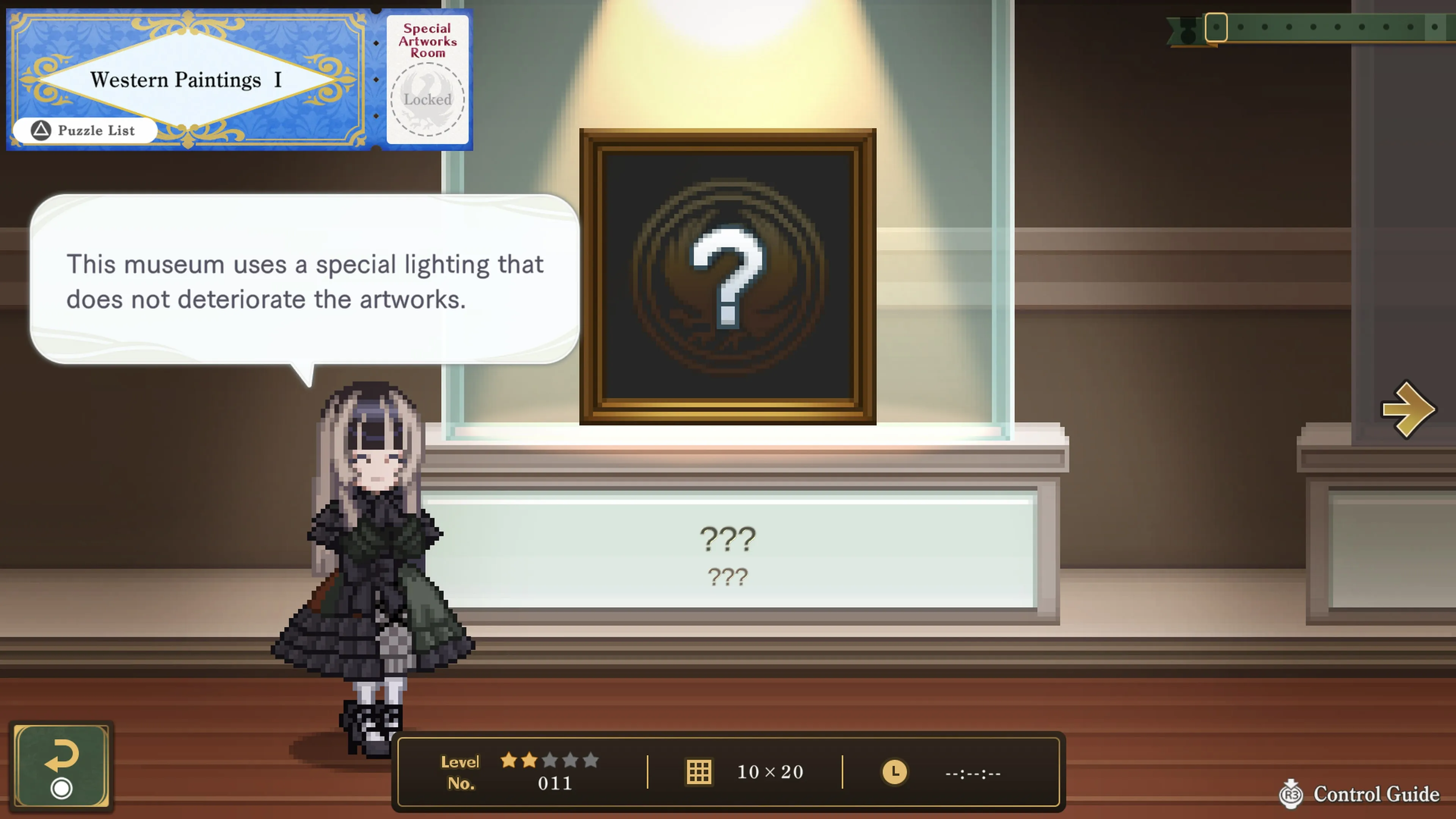 Acompáñala en un recorrido por el museo, resuelve puzles y completa las distintas obras en píxeles que llenan sus salas.