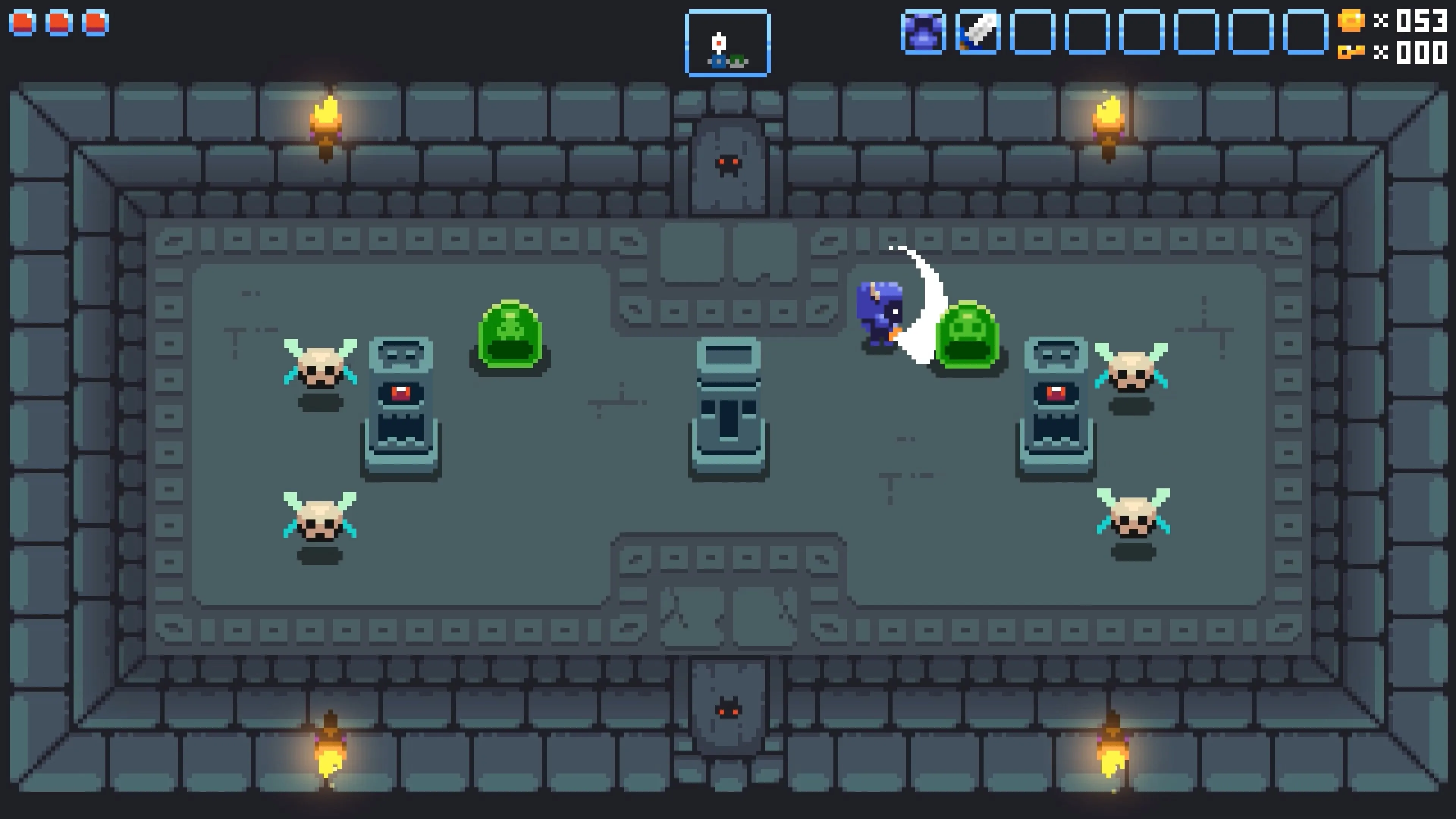 Sobrevive a las cuatro mazmorras y desbloquea nuevas destrezas y nuevos elementos que pueden ayudar a Sir Lootalot a derrotar a sus enemigos.