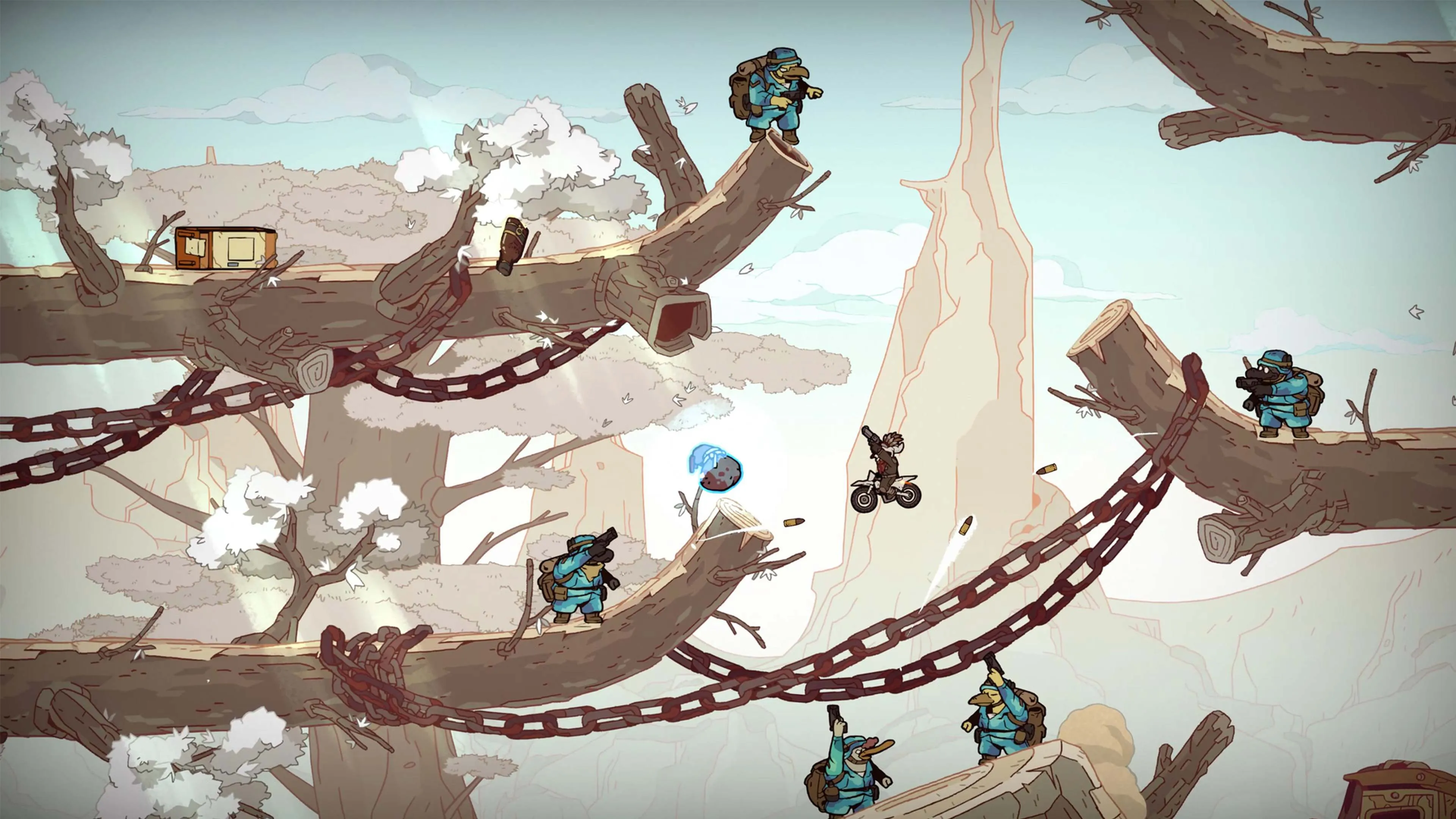 Conduce, salta y ábrete camino con la moto por el inmenso mundo dibujado a mano. ¡Corre por el páramo y realiza saltos peligrosos, dispara a los enemigos a cámara lenta y recarga tu arma haciendo una voltereta hacia atrás! ¡Consigue mejoras mediante habilidades y libra difíciles batallas contra jefes gigantes!
