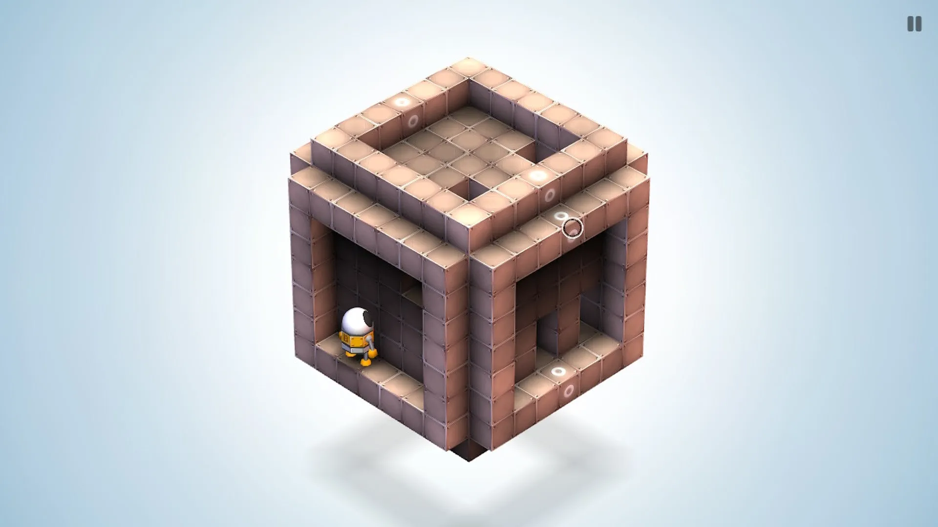 Explora cada nivel, rotándolo en 3D para ver todos sus lados y buscar el camino a la meta. Usa ascensores y plataformas móviles para desplazarte, prestando atención a posibles riesgos.