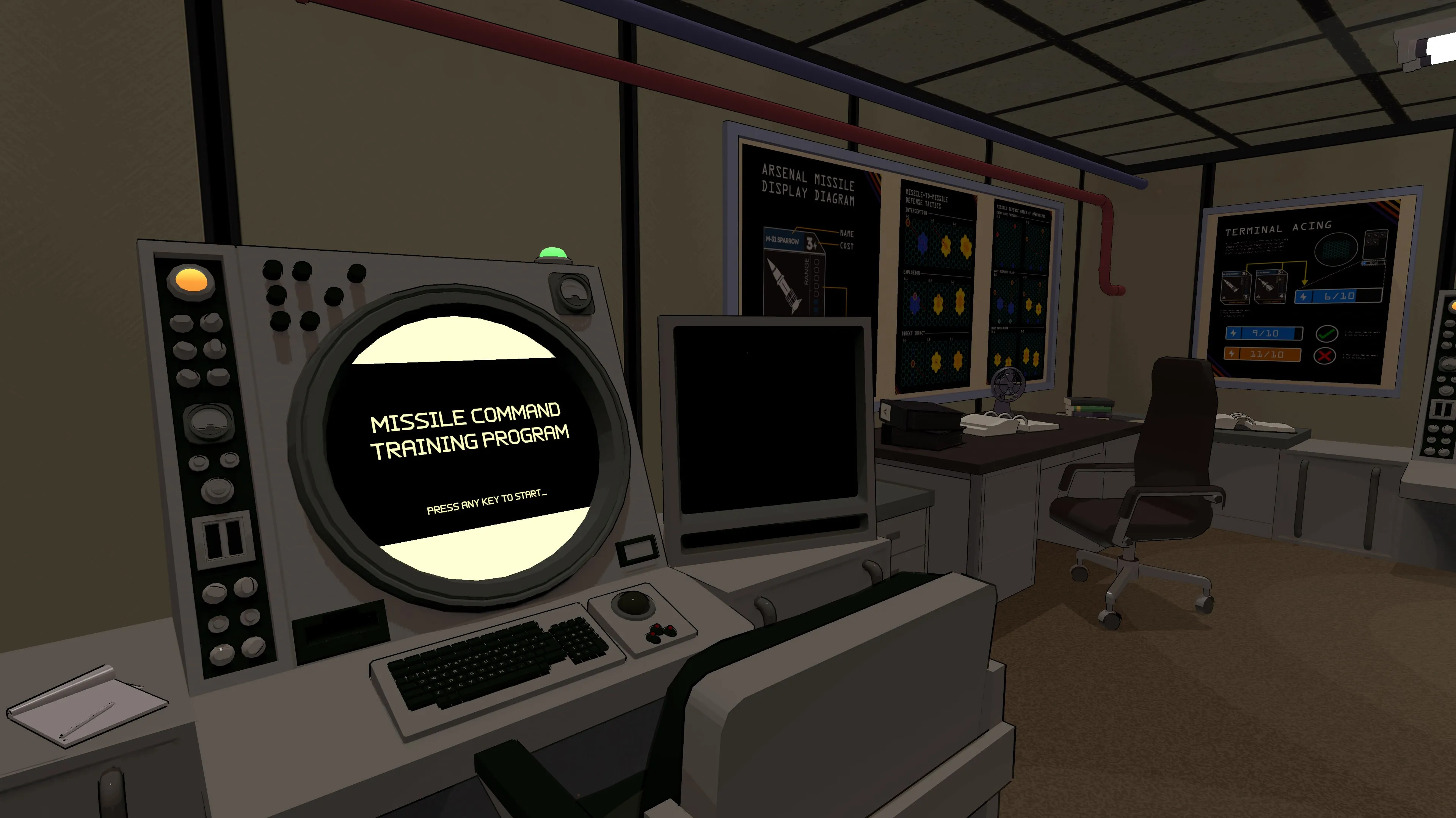 Una claustrofóbica estética retrofutura de polvorientas consolas de mando y superordenadores te sumerge de lleno en la paranoia de la Guerra Fría.