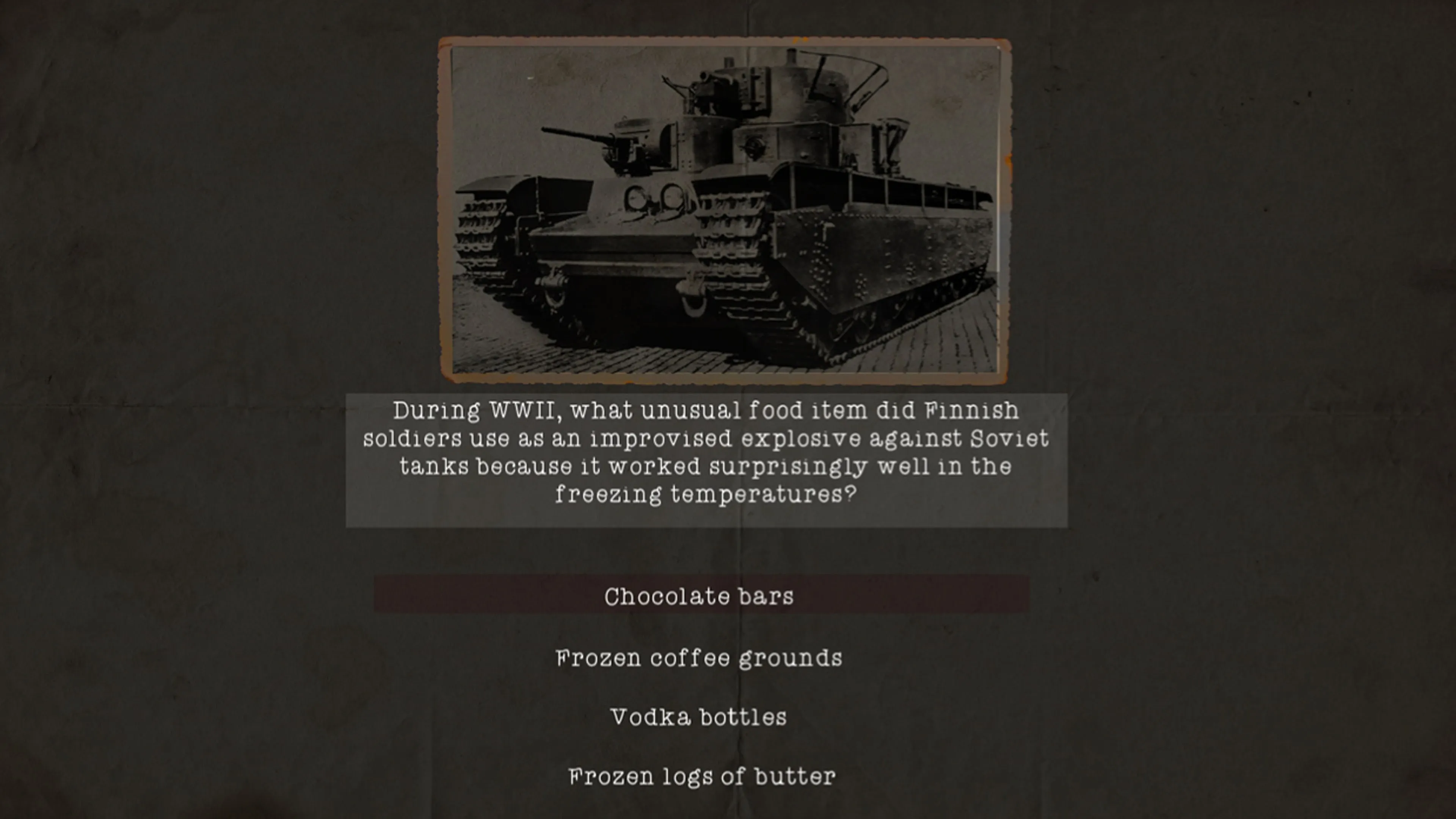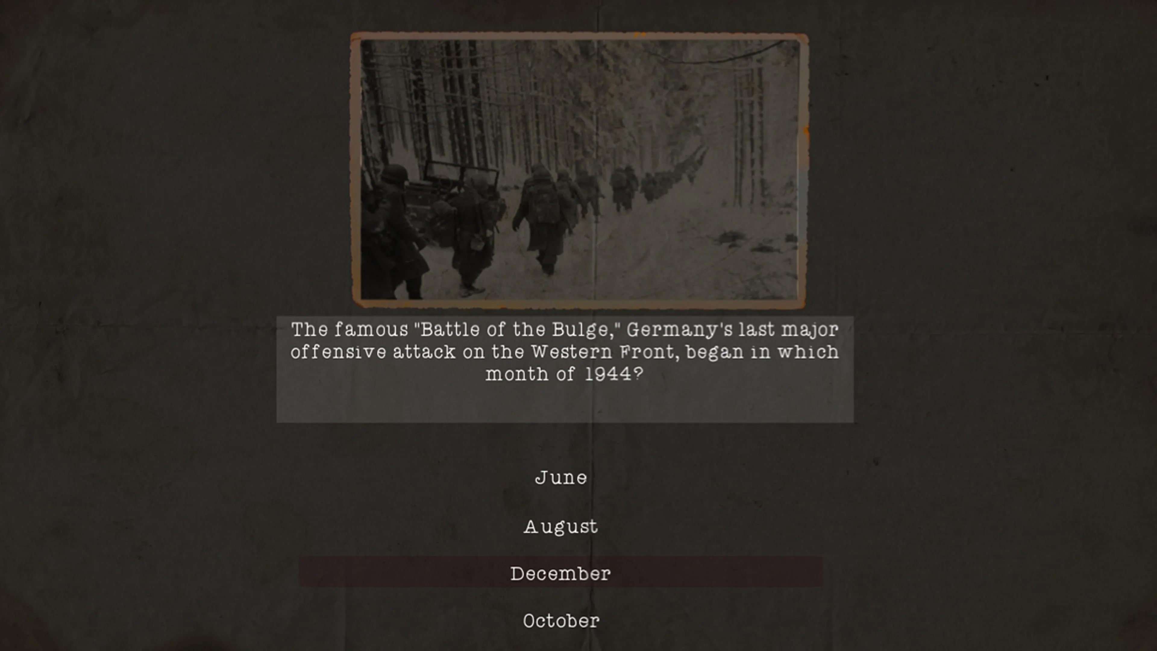 "No Tears for Heroes" es un juego de preguntas y respuestas en el que debes intentar desbloquear un cortometraje sobre la Segunda Guerra Mundial respondiendo las preguntas del cuestionario.