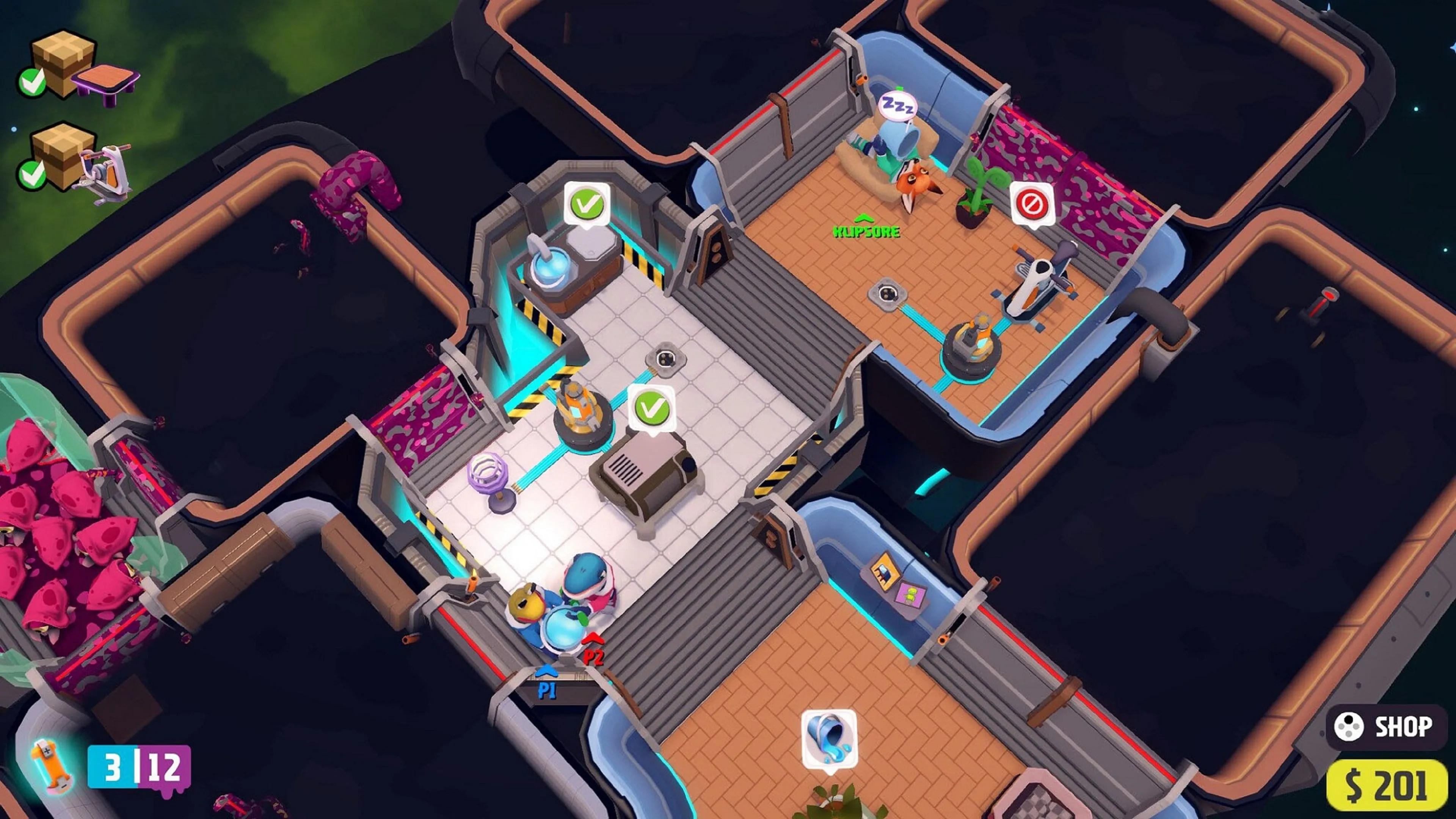 Cada partida empieza en una casa espacial generada automáticamente que exige tus mejores habilidades de planificación y trabajo en equipo para que sea limpia y cómoda. Tú y tus amigos tendréis que producir recursos, reciclar basura y baba alienígena, comprar y construir nueva tecnología y cuidaros unos a otros, si alguna vez queréis llamar hogar al desastre en el que os habéis metido.
