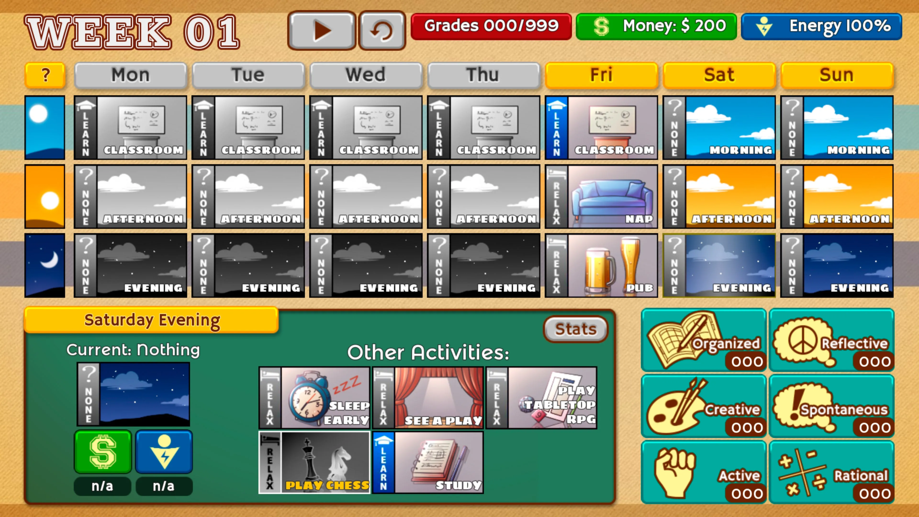 * Juego de simulación de vida con un horario completo y aumento de las estadísticas