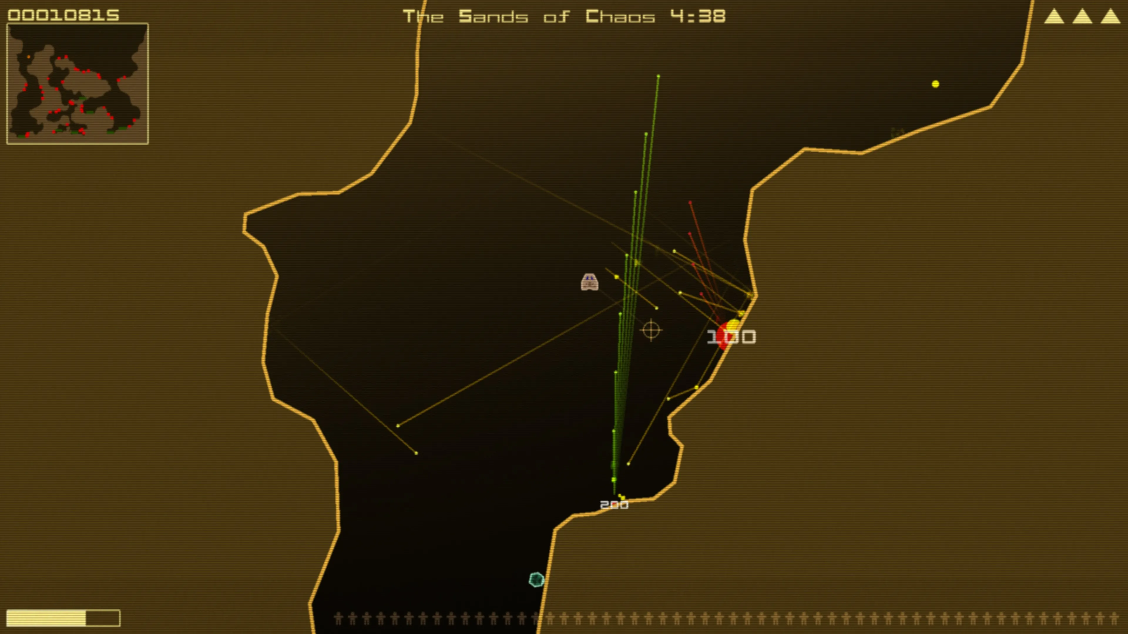 Cuando se recogen todos los humanoides, vuela alto sobre el planeta para escapar, asegurándote de tener suficiente combustible. Vigile los niveles de combustible y destruya los vertederos de combustible para reponer.