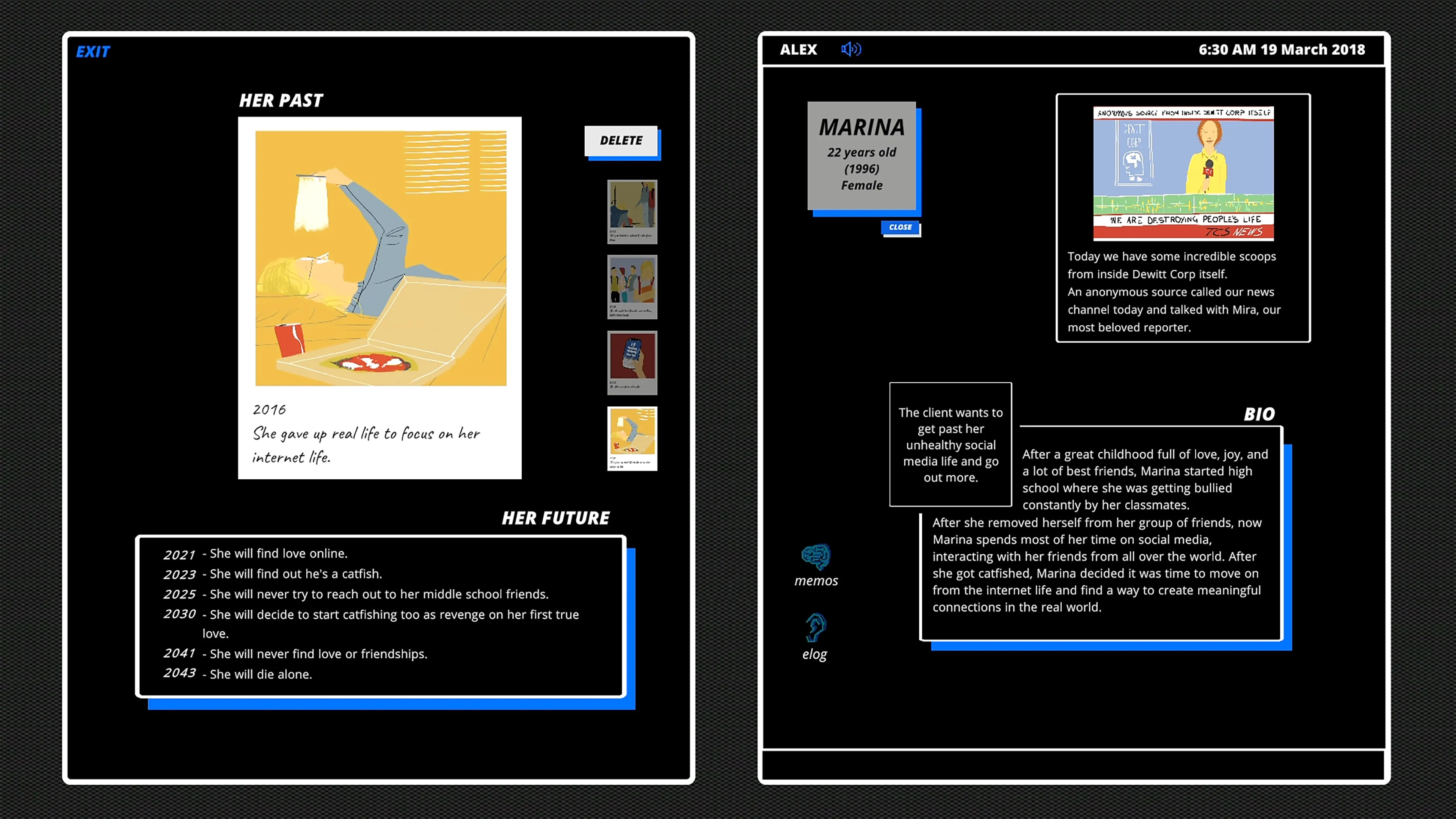 Para cada cliente, recibirá una serie de información personal en su PC que podrá analizar. Elija con cuidado, cada recuerdo eliminado puede tener efectos enormes en el presente y el futuro del cliente.