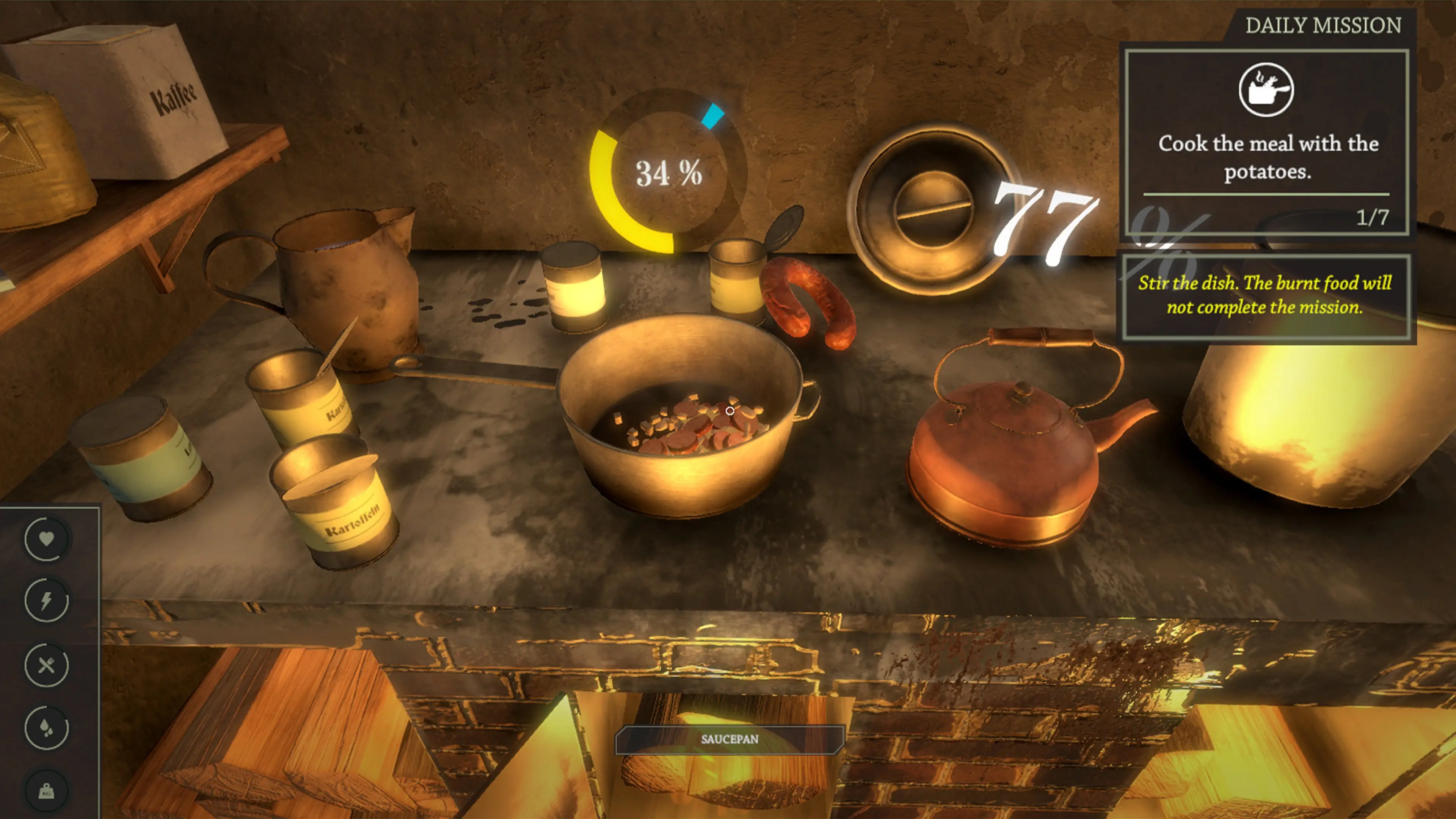 Los soldados también son personas y, entre combate y combate, necesitan descansar, alimentarse y recuperar energías. El enemigo no esperará a que estés preparado. El día es corto. Te esperan numerosas tareas. Prepara comida para recuperar las fuerzas.