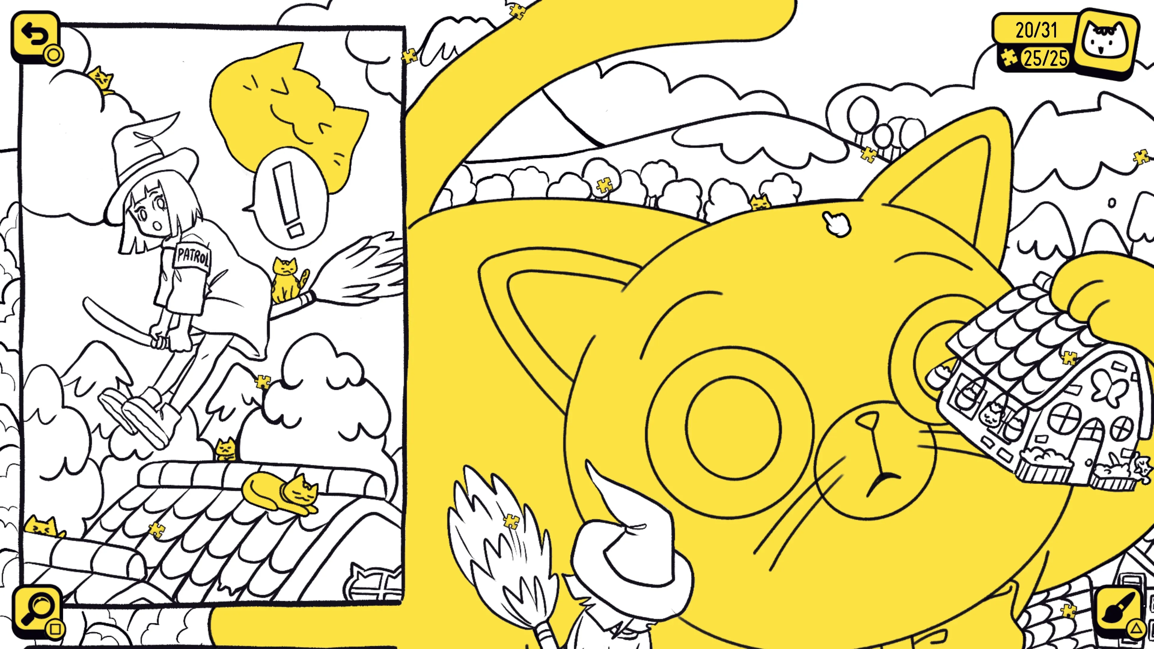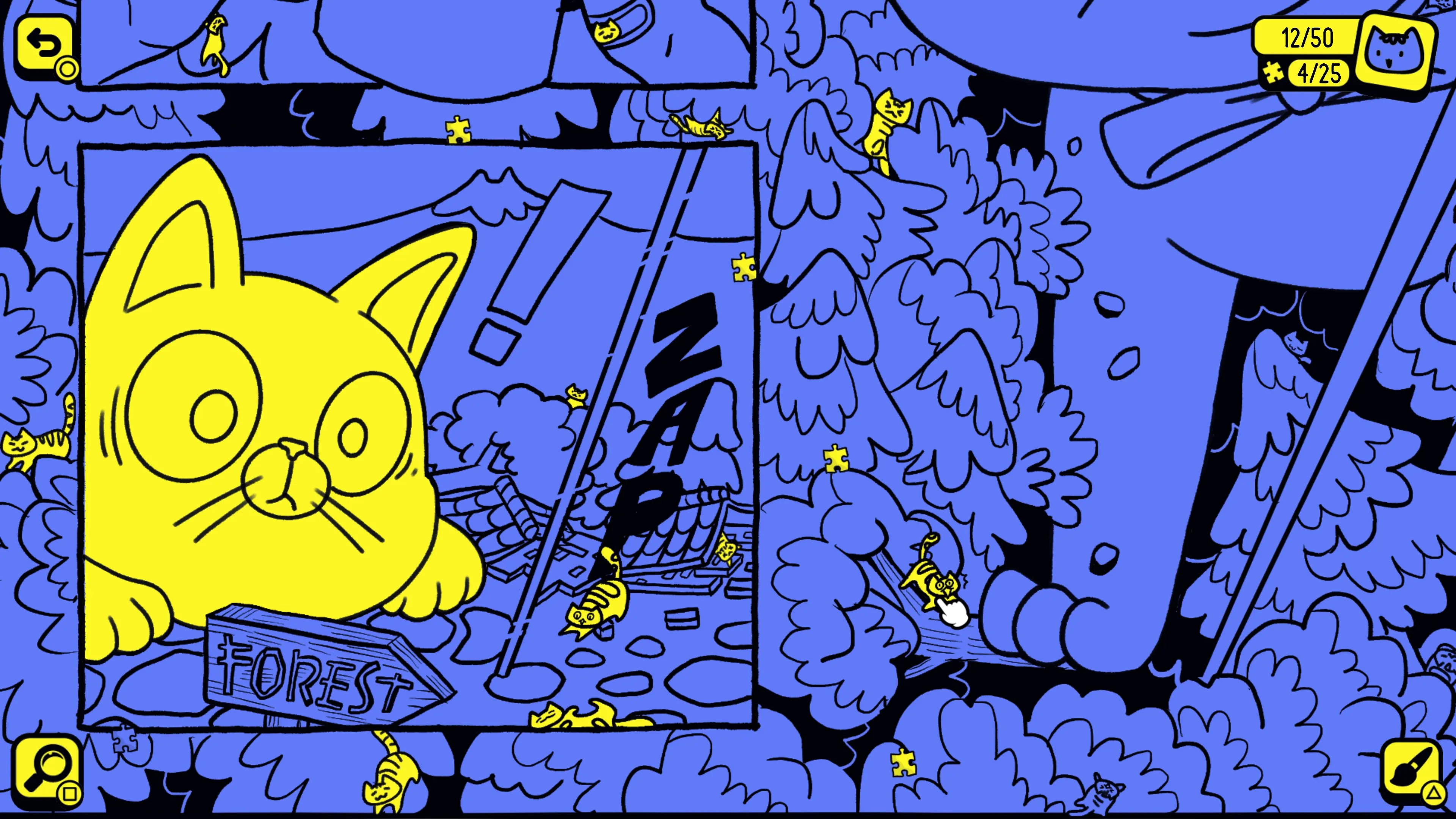 Explora cuatro páginas de cómic ilustradas en busca de cientos de felinos y completa los relajantes rompecabezas.