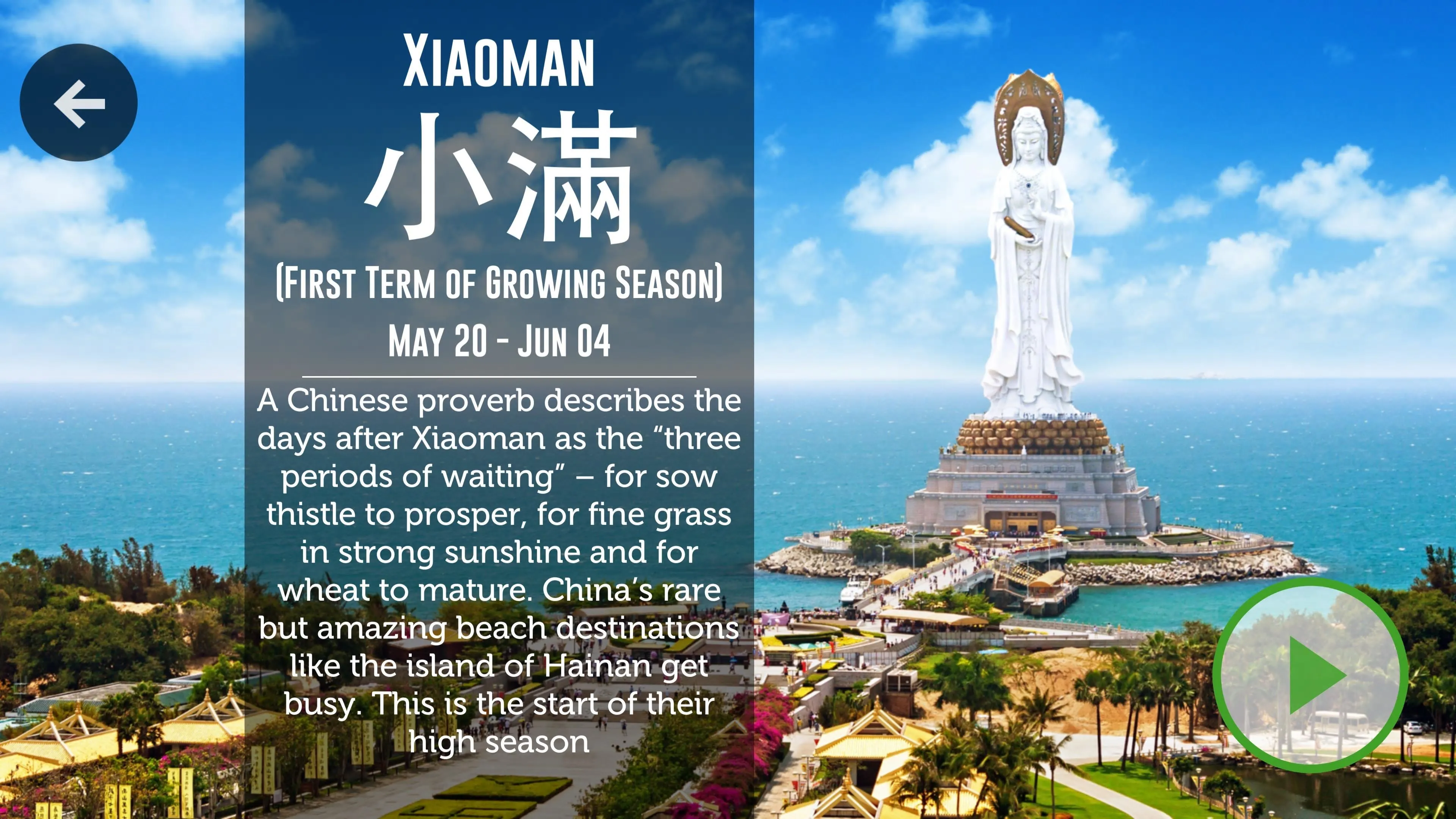 Cada una de las 24 estaciones (términos solares) ha sido diseñada como una obra de arte, combinando vistas increíbles y tradicionales de toda China según la temporada.
