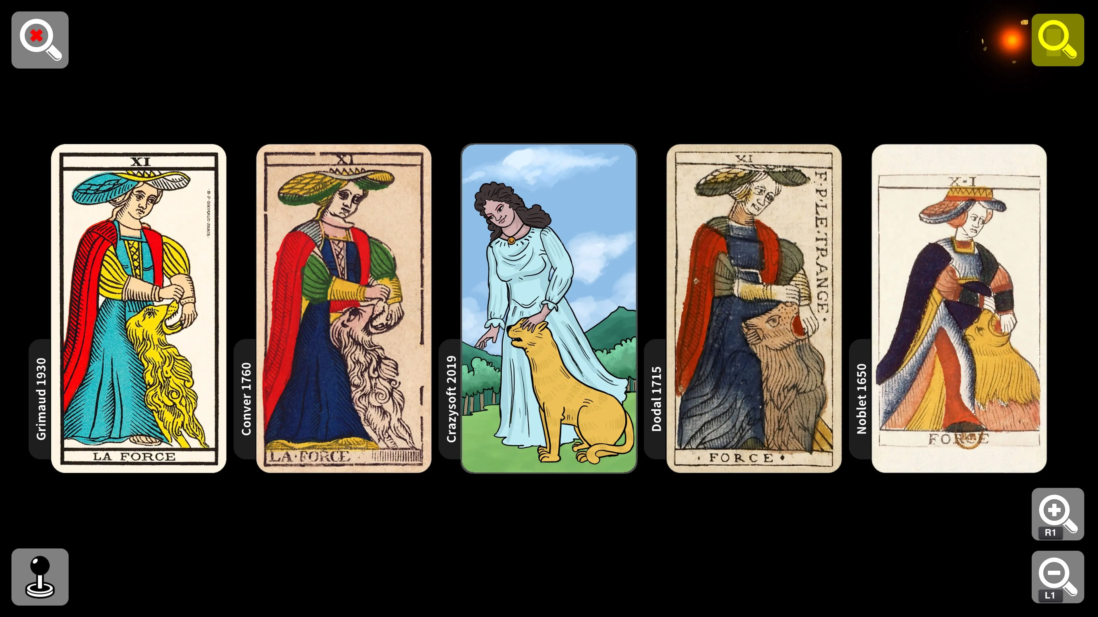 2) 5 mazos completos de 78 cartas. (1 animado y 4 históricos: Grimaud, Conver, Dodal, Noblet)
