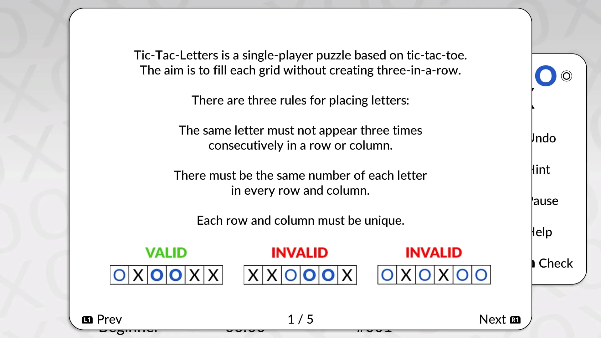 Comience colocando letras para que no haya más de dos X u Os consecutivas en una fila o columna. Luego continúe con nuevas letras y rompecabezas más grandes y desafiantes.