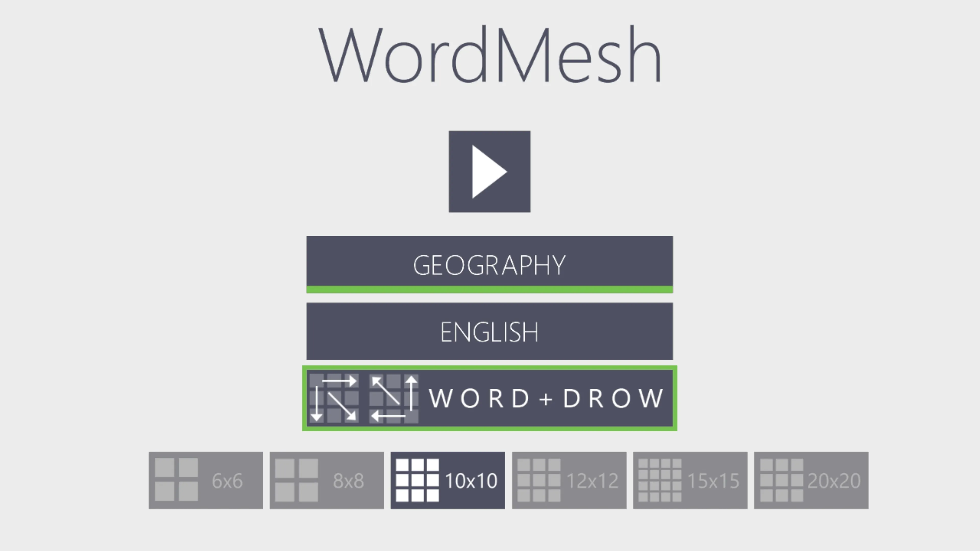- Tamaños de Word Mesh: 20x20 15x15 12x12 10x10 8x8 6x6 letras campo de juego