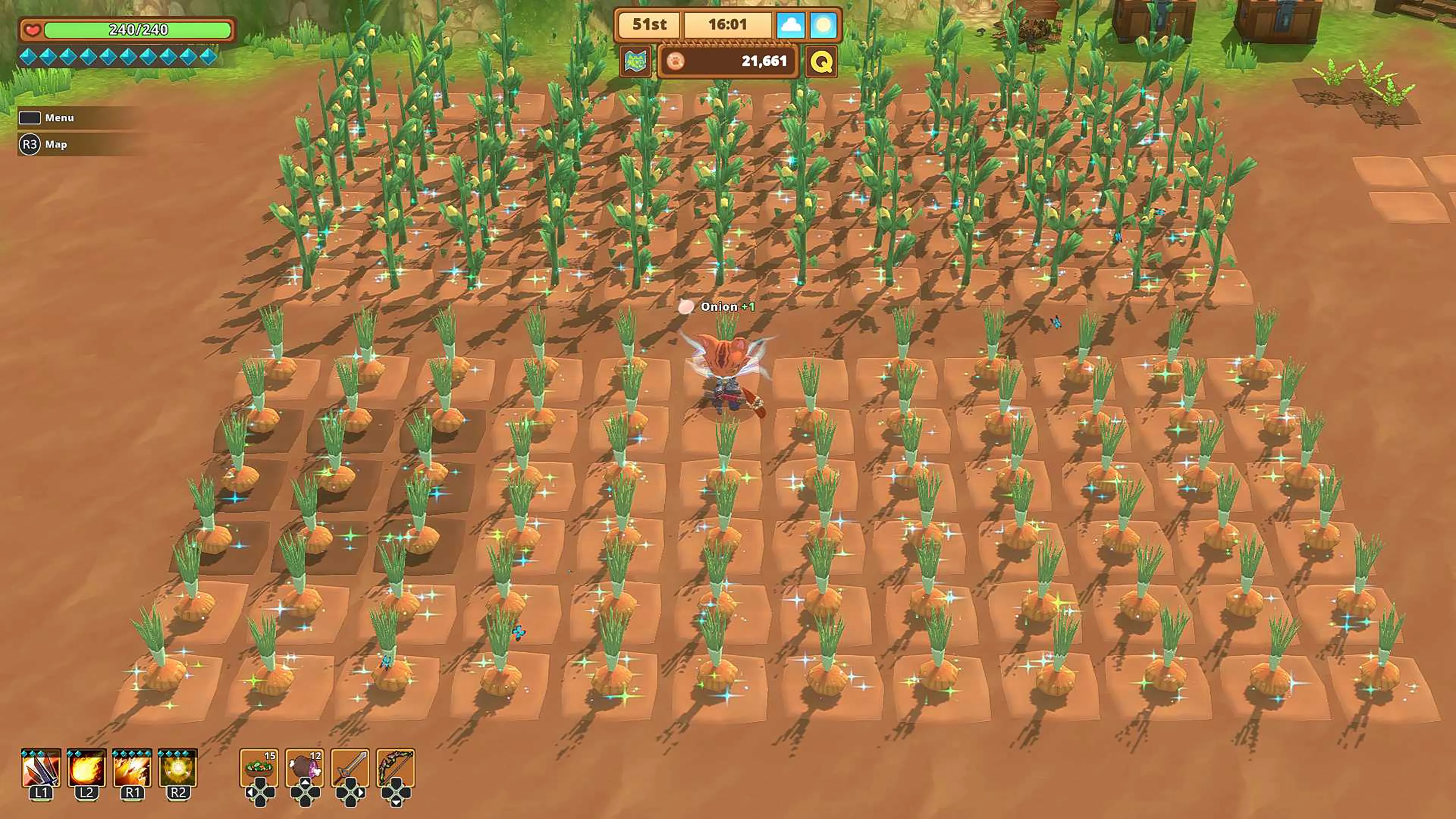 ¡Recoge, fabrica y cultiva! ¡Toda Kitaria está repleta de recursos que podrás usar a tu favor! Derrota a monstruos para conseguir ingredientes, planta semillas y cosecha tus cultivos para hacerte con provisiones, y reúne materiales y minerales para fabricar armas, armaduras y accesorios aún más poderosos.