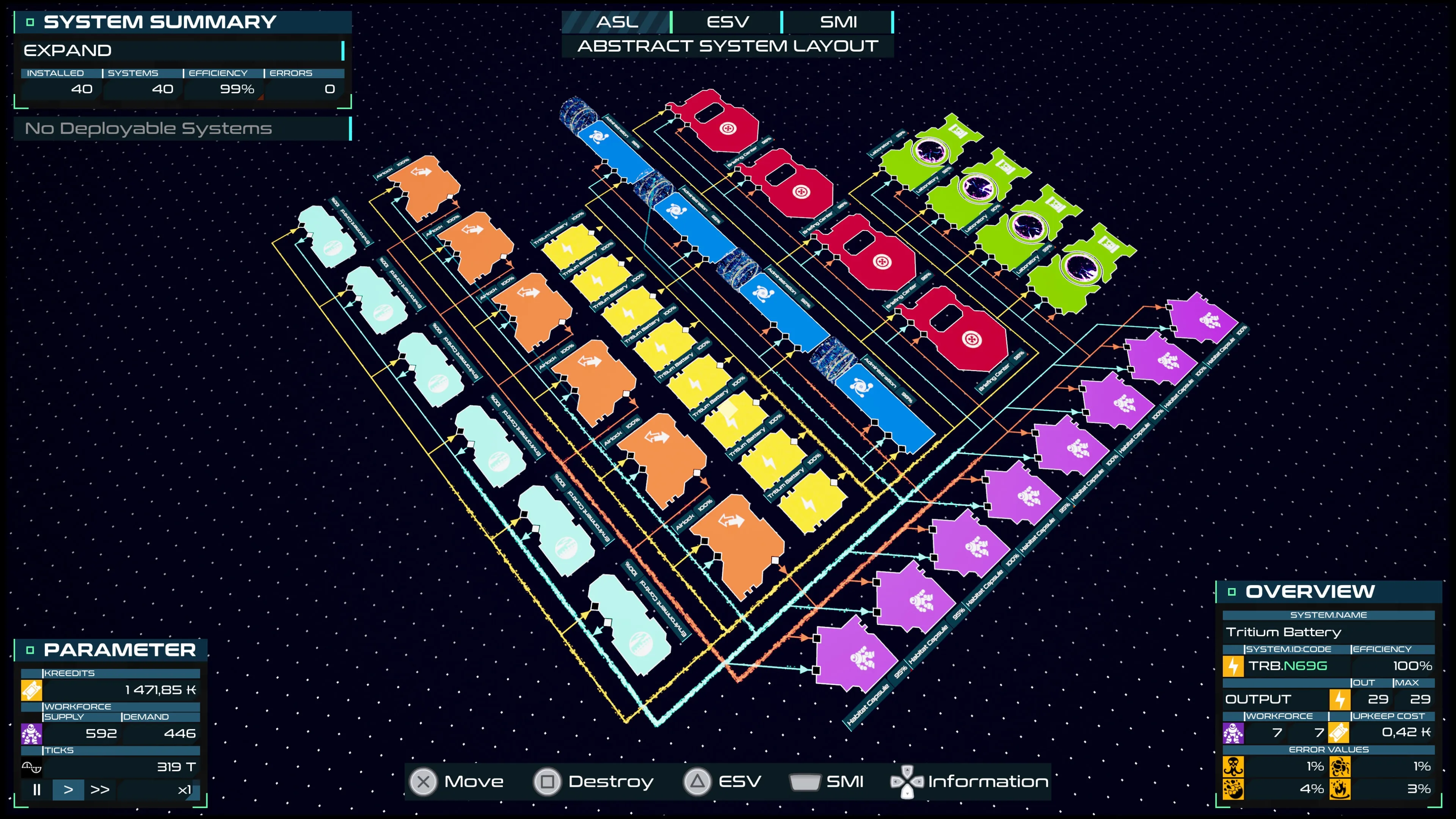 Supervisa y programa ciclos de producción, gestión y distribución de recursos. Céntrate en la eficiencia o en el rendimiento, y organízalo todo al dedillo, pero siempre con un sistema de representación abstracto que se asemeja a un panel de circuitos. ¡Esto te ayudará a diseñar las mejores conexiones al detalle para que tu estación se convierta en una proeza de la ingeniería!