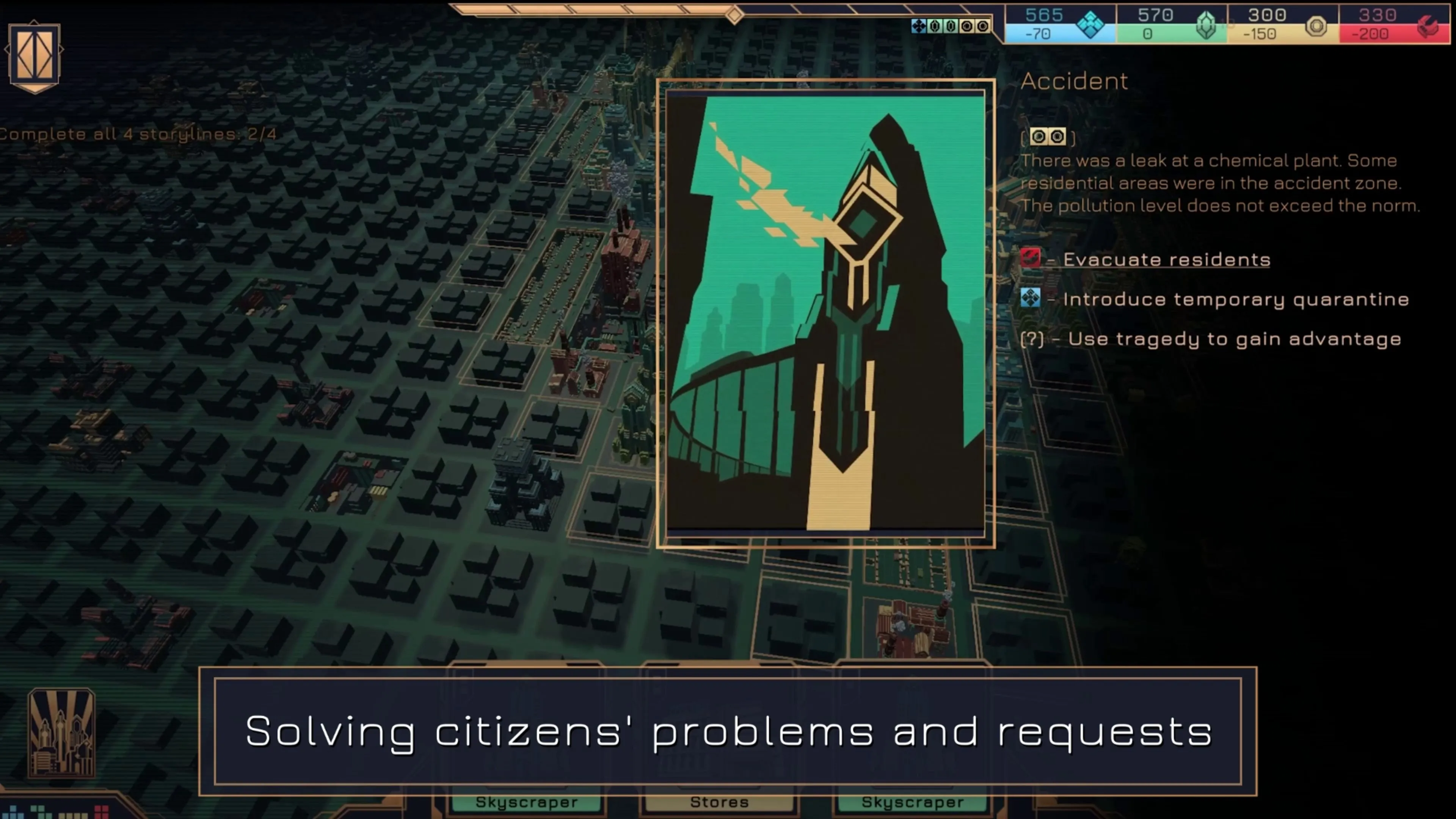 Una ciudad es un organismo vivo, donde siempre ocurre algo que requiere tu atención. ¿Dónde albergas a las víctimas del incendio? ¿Qué haces con la banda que ha tomado el control de algunos distritos? Las facciones ofrecerán soluciones, pero tú decides si las sigues o si impulsas tus propios planes.