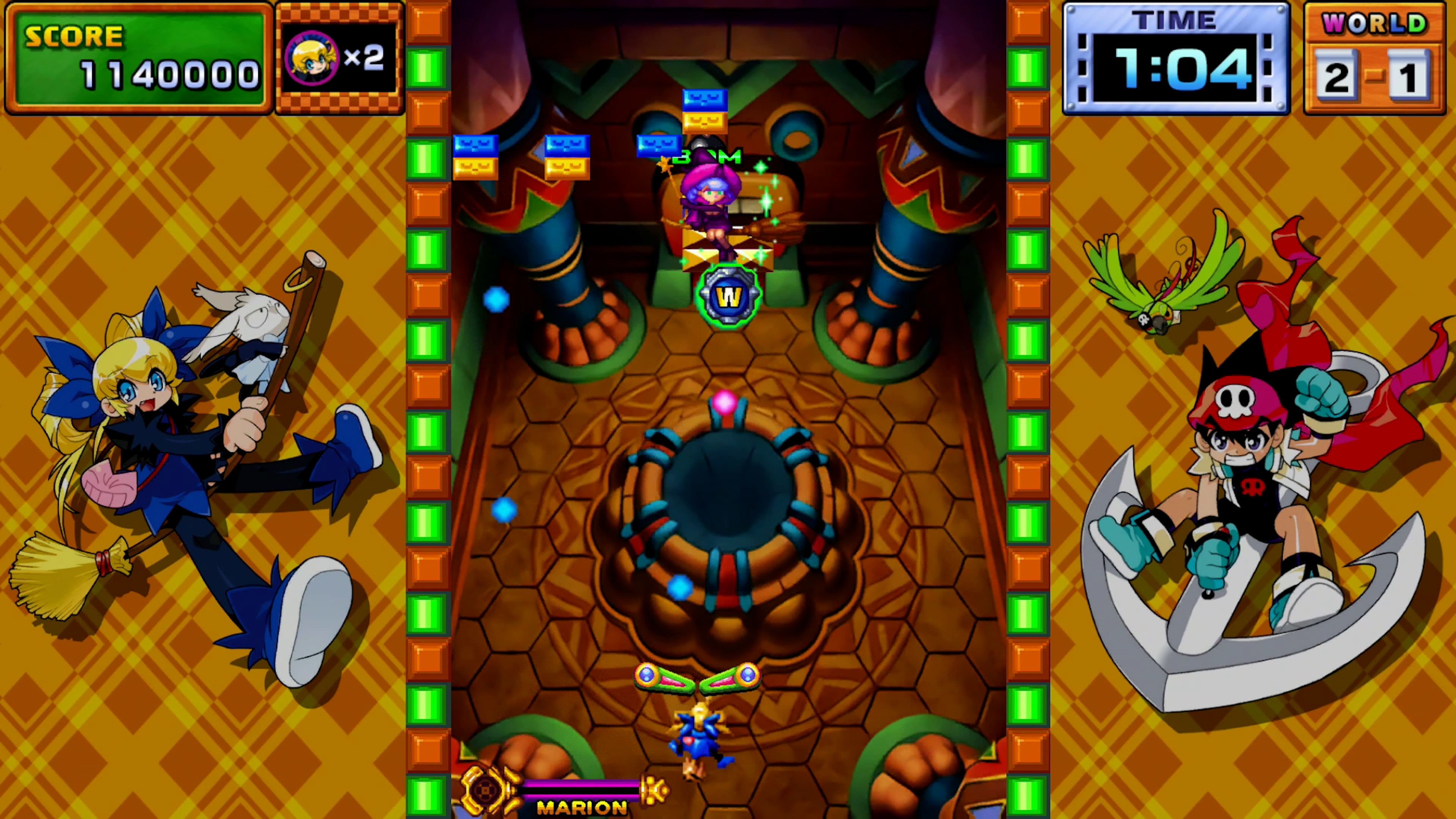 Rompe todos los bloques para completar el nivel usando las paletas para disparar la bola rosa (disco).