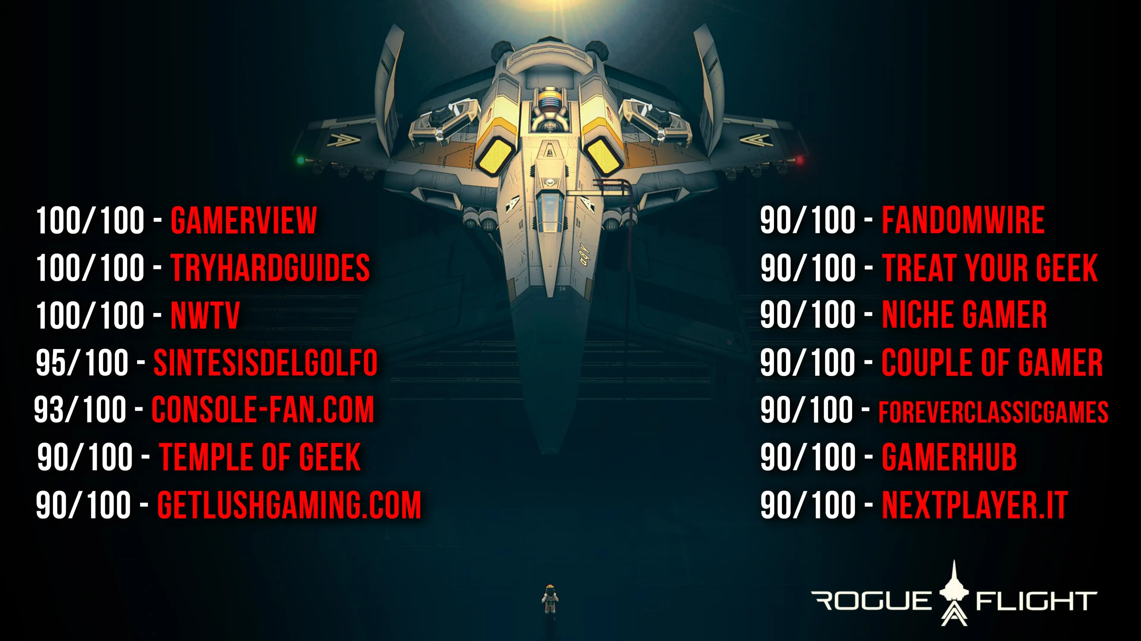 “Con una excelente arte/presentación, una jugabilidad emocionante y vertiginosa, una historia atractiva y una de las mejores bandas sonoras de videojuegos que he escuchado en mucho tiempo, es imposible no recomendar Rogue Flight. Es obvio en cada detalle que está hecho con mucho amor, tanto a sí mismo como a los emblemáticos títulos del pasado, por lo que no me imagino a nadie probando este juego y diciendo en serio que no le ha gustado.” 10/10 Try Hard Guides